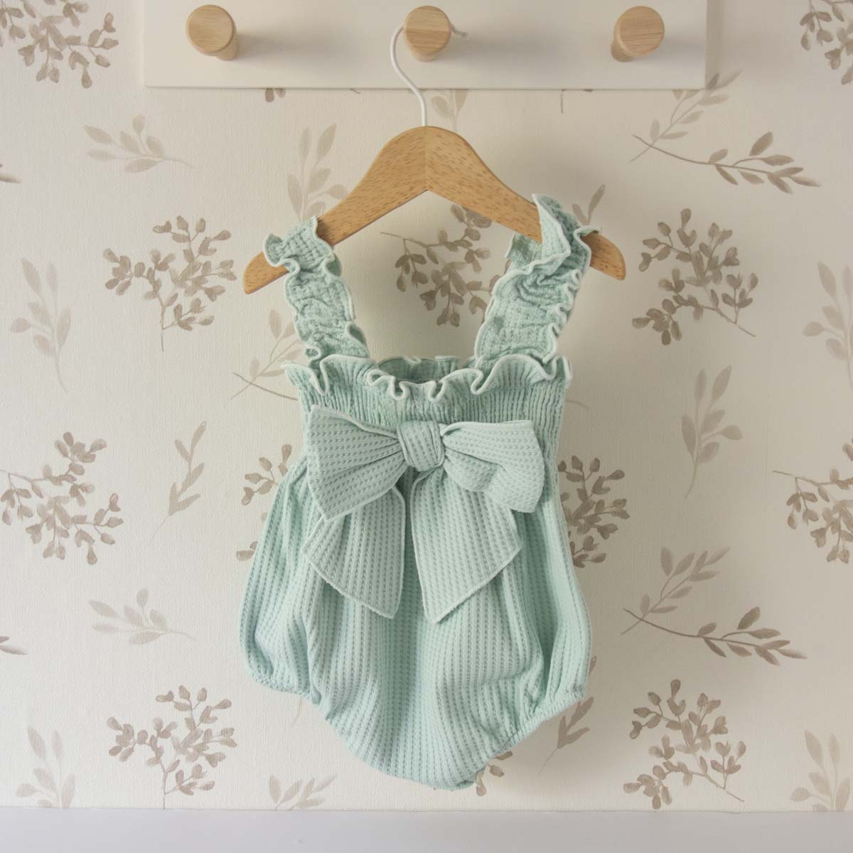 Su precioso tono mint empolvado transmite frescura y dulzura, creando un look ideal para los meses de primavera y verano. El gran lazo frontal y los tirantes fruncidos aportan un aire romántico y elegante que convierte esta prenda en una opción perfecta para vestir a las más pequeñas con estilo.