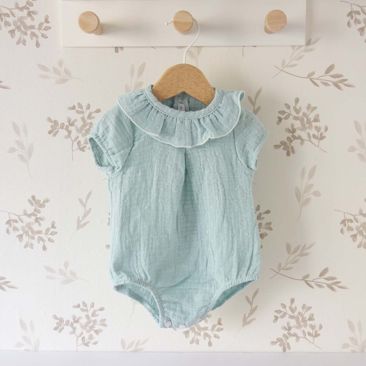 Una prenda que transmite frescura y dulzura. Esta ranita de algodón 100% plumeti en color turquesa es ligera, transpirable y extremadamente suave para la piel del bebé. El cuello volante aporta un aire romántico y delicado que la convierte en una opción ideal para paseos especiales, celebraciones familiares o sesiones de fotos veraniegas. Una pieza cómoda y elegante seleccionada con mimo en nuestra Boutique de la Castellana.