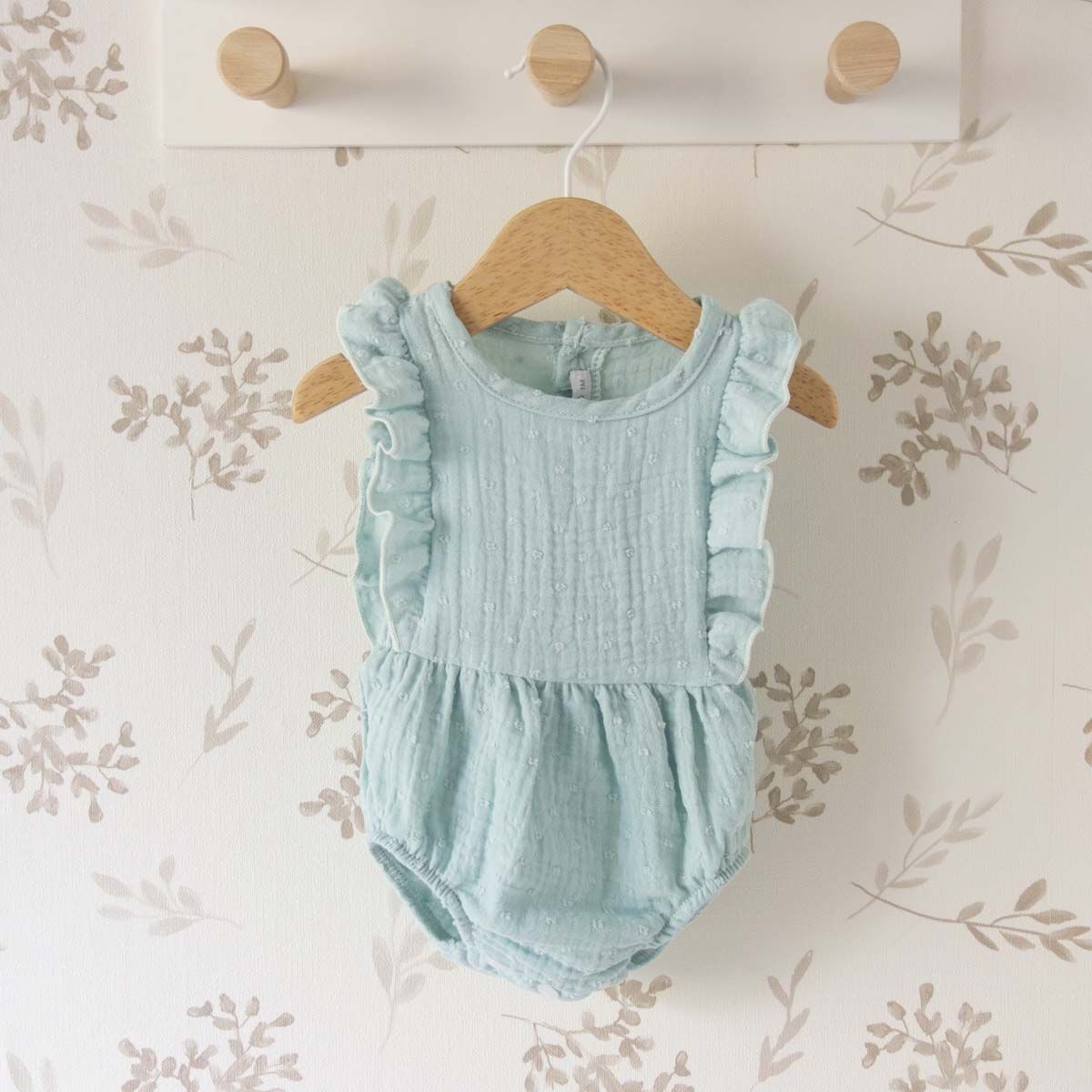 La ranita bebé plumeti turquesa destaca por sus delicados volantes en los hombros que añaden movimiento y personalidad al diseño.