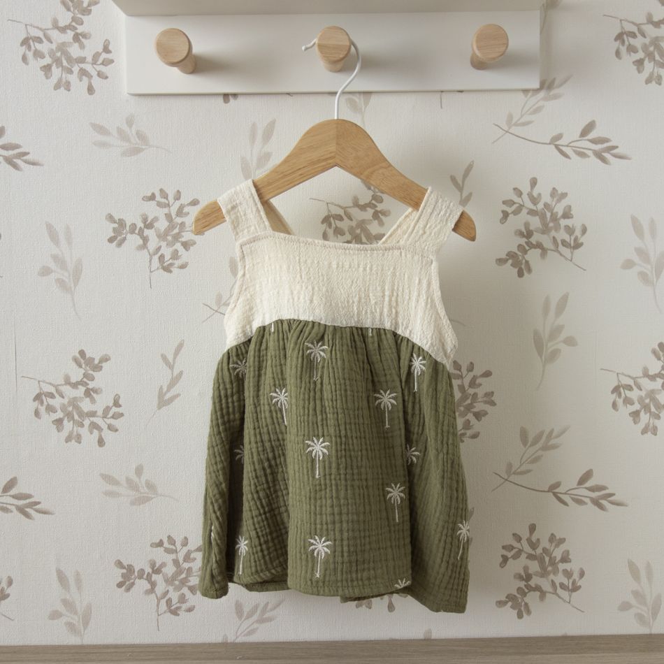 Hay vestidos infantiles que evocan verano incluso antes de vestir al bebé. Este vestido bebé palmeras verde oliva de la colección Mathura de Calamaro refleja una estética natural, luminosa y delicada que encaja perfectamente con la moda infantil veraniega.