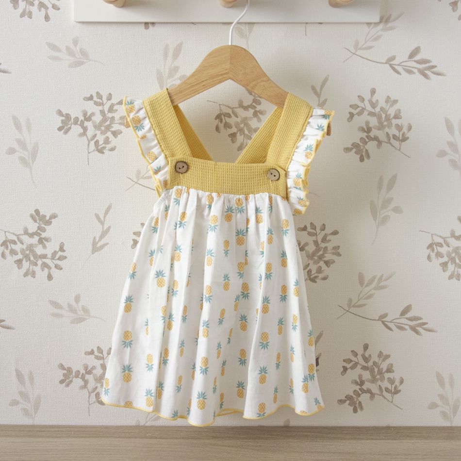 La parte superior del vestido incorpora tirantes anchos en tejido waffle amarillo, que aportan estructura y contraste visual. Estos tirantes se cruzan en la espalda, creando una silueta muy característica de la moda infantil clásica.