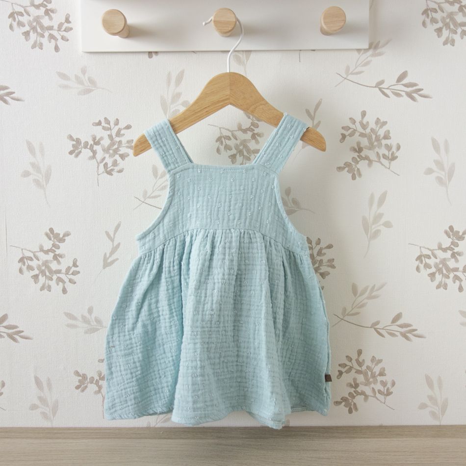 El tono turquesa combina con facilidad con sandalias suaves, capotas de algodón o chaquetas de punto fino, creando conjuntos infantiles armoniosos y elegantes.